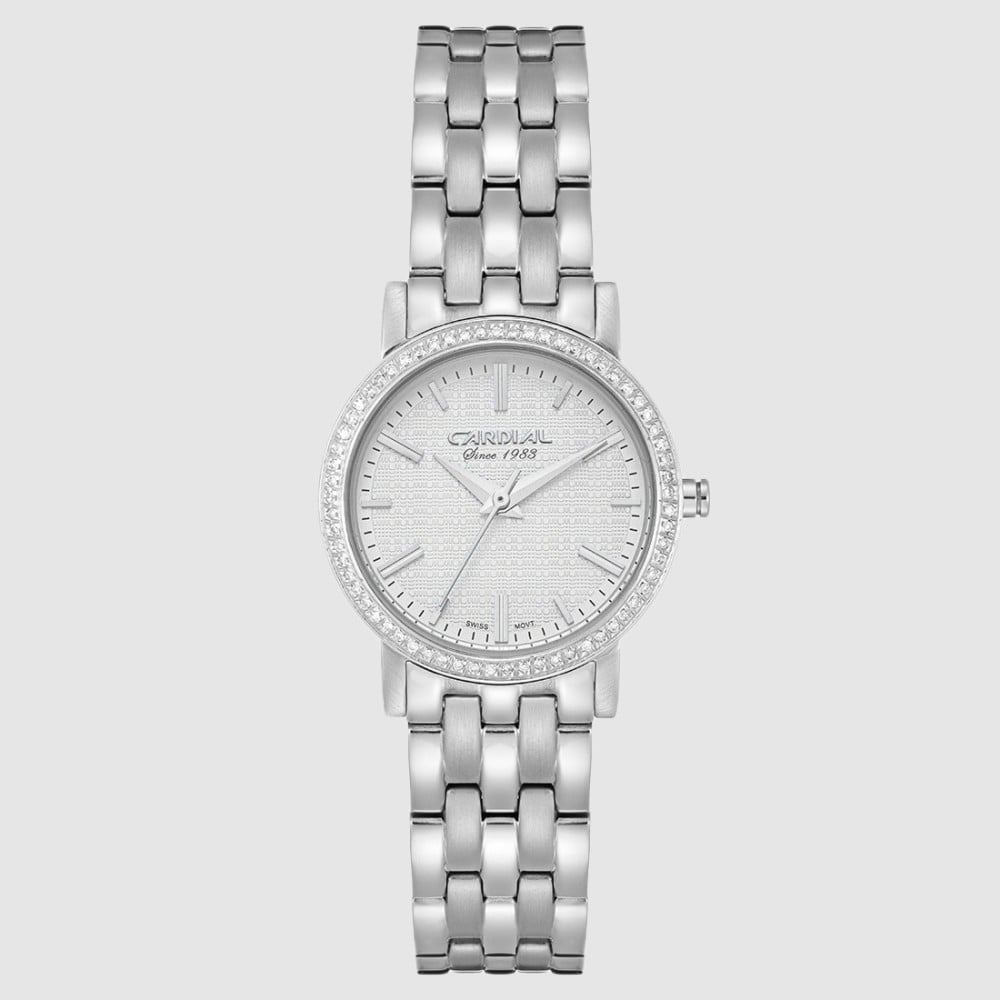 ساعة كارديال المرصعة بالالماس تتوزع الألماسات على الساعة بشكل متناغم ودقيق على الإطار،مما يخلق تأثيرًا مبهرًا ويجعل الساعة تتلألأ بأناقة لافتة.