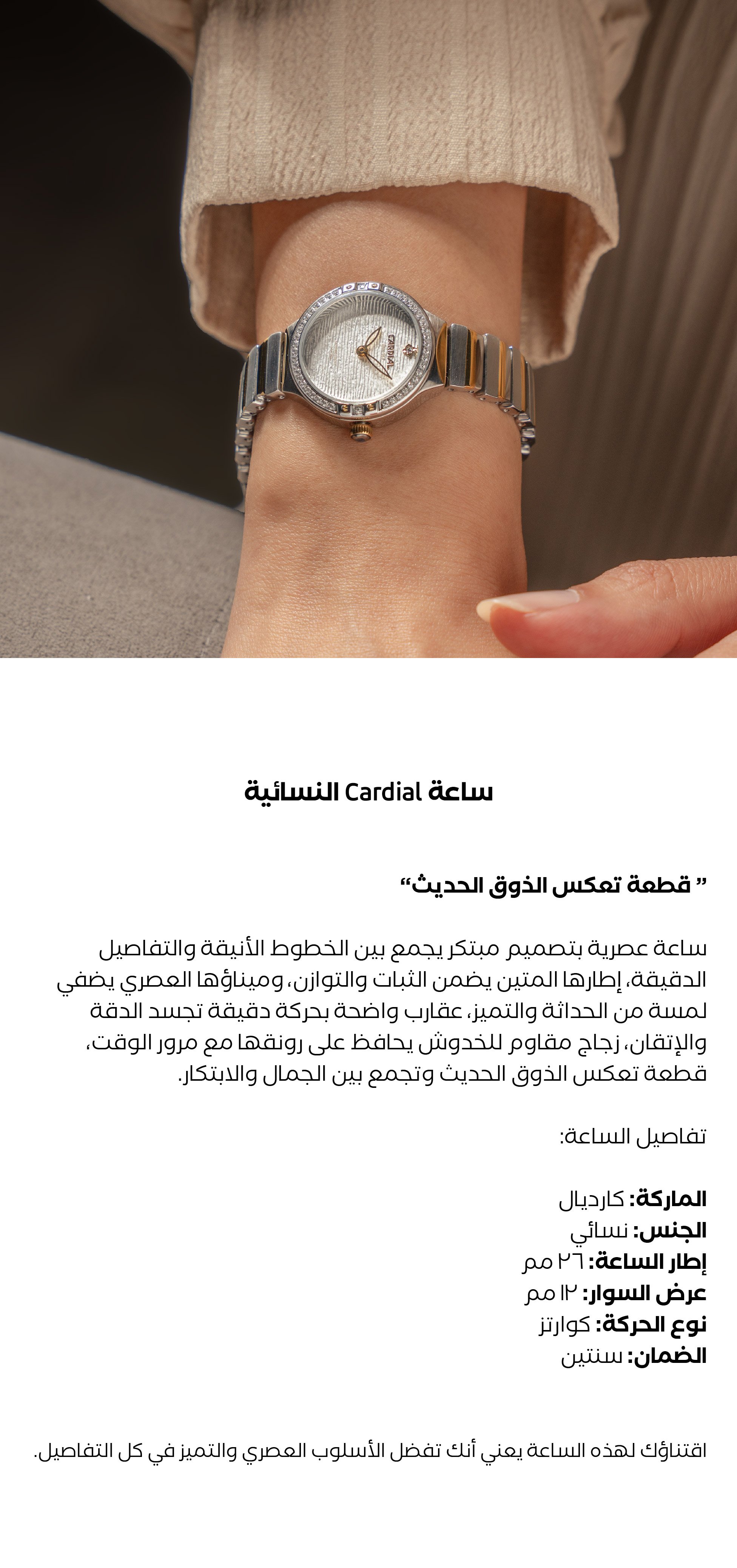 اقتني الآن ساعة يد نسائية فضيه من كارديال بتصميم أنيق ولمعان فاخر يكمّل إطلالتك اليومية، لكي تتألقي كل لحظة مع ساعة تجمع بين الرقي والدقة، وكوني دائمًا محط الأنظار.